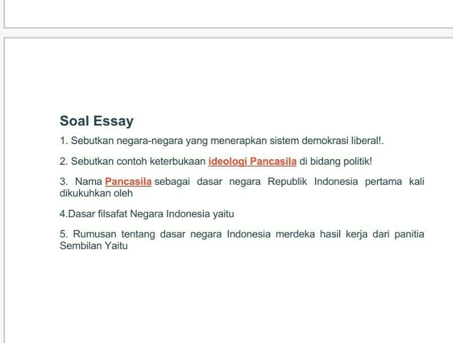 Pembaca sekolahmuonline, berikut ini kami sajikan kepada pembaca semuanya, contoh soal essay pendidikan kewarganegaraan (pkn) atau pendidikan pancasila dan . Esai / isian (5 soal). Konstitusi yang pernah dipakai di . 1.kenapa pancasila dijadikan ideologi bangsa indonesia? Rumusan dan susunan pancasila yang benar dan sah tercantum dalam ….